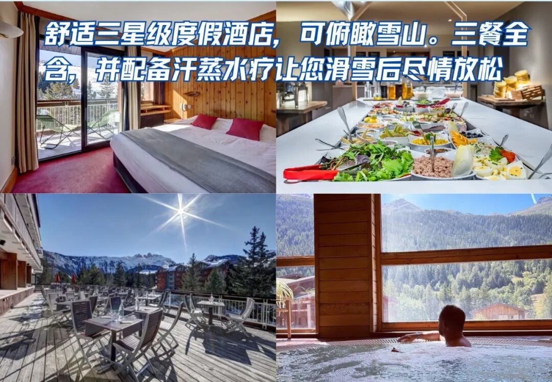 ·全包式餐饮:酒店提供每日早晚餐自助,菜品融合法式与国际风味。滑雪归来可在餐厅或壁炉旁享用热汤、奶酪与甜点,感受浓郁的法式度假气息。午餐可预订野餐包。